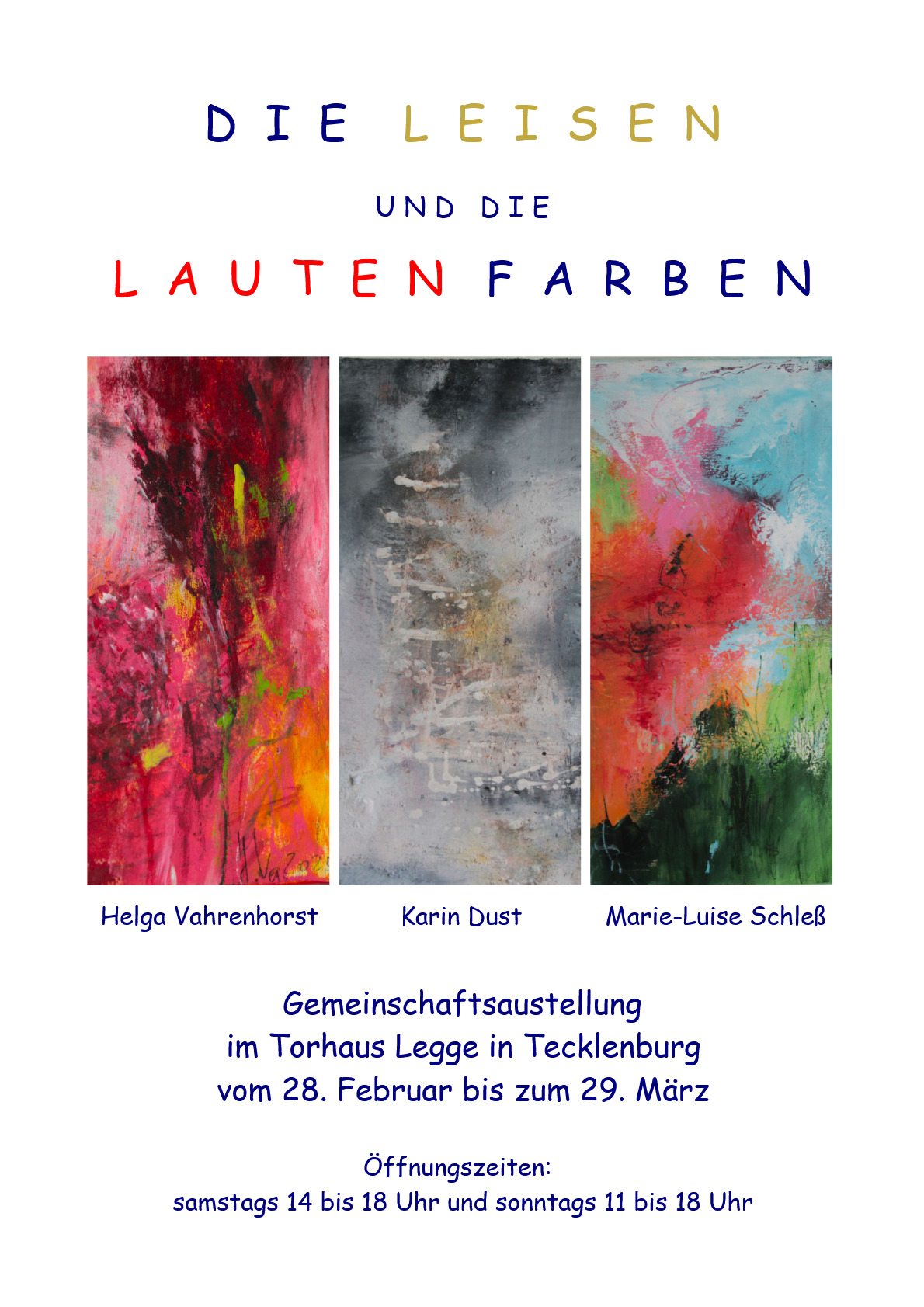 admin_tecklenburg_touristik2026-02-20T15:54:01+01:00Die drei Künstlerinnen Helga Vahrenhorst, Karin Dust und Marie-Luise Schleß zeigen ihre neuen Werke vom 28. Februar bis zum 29. März im Torhaus Legge in Tecklenburg.