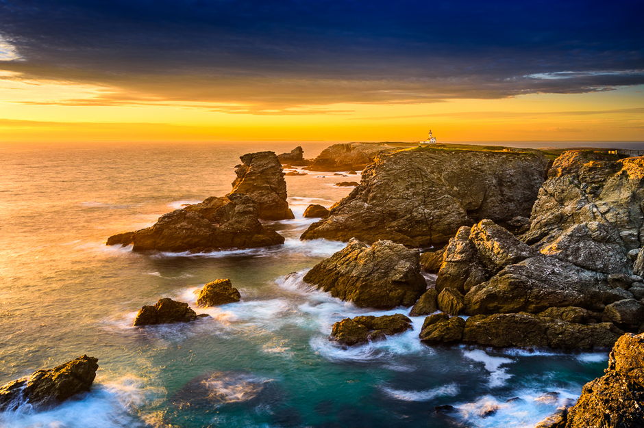 Zahllose Leuchttürme sprenkeln die Küste, endlose Sandstrände wandeln sich im Rhythmus des höchsten Tidenhubes Europas, Inseln wie Ouessant und Belle-Île trotzen der Wucht der Winterstürme. Fischerdörfer ducken sich in geschützte Buchten, während Städte wie Saint-Malo, Brest, Roscoff oder Concarneau vom Leben an und mit der See erzählen. Im Landesinneren erstrecken sich die mythischen Wälder von Brocéliande und Huelgoat, Megalithanlagen wie Carnac oder Gavrinis zeugen vom frühen spirituellen Erleben des Menschen.